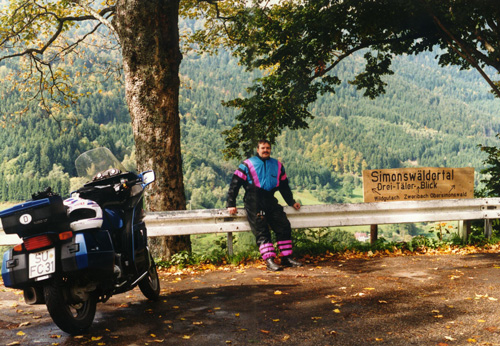 Gestärkt durch Kaffee und Kirschtorte geht unsere Tour auf der Schwarzwald Panoramastraße weiter. Auf sechs bis sieben Kilometern windet sich die Straße in Kurven und Kehren hinunter ins Tal bis nach Sankt Peter. Die Natur bietet Grüntöne in allen Abstufungen. Wir sind auf unserer K100 LT von dem Fahrspaß so begeistert, daß wir die Orte Eschbach und Stegen nur am Rande streifen. Von Stegen geht es über einen kurzen Streckenabschnitt auf der B 31 weiter nach Kirchzarten. Kirchzarten liegt in einer spannungsreichen Landschaft zwischen Berg und Tal und gilt als ein Zentrum des Dreisamtals. Von Kirchzarten führt uns die Strecke auf der L 126 vorbei an Oberried hinauf nach Notschrei. Die Strecke bis Notschrei zeichnet sich auf den letzten Kilometern nicht nur durch zahlreiche Kurven, sondern auch durch eine bemerkenswerte Steigung aus. Vorbei an duftenden Wiesen, dichten Wäldern und kleinen verträumten Bergbauernhöfen geht es von Notschrei auf der Schauinslandstraße (L 126) talabwärts durch Muggenbrunn und an Aftersteg vorbei nach Todtnau. Unsere Route hat uns bisher schon viele positive Eindrücke des Hochschwarzwaldes vermittelt, dennoch, dies zeigt unser Tageskilometerzähler, haben wir gerade einmal 100 km zurückgelegt. In Todtnau fahren wir auf der B 317 (Feldbergstraße) hinauf zum Feldberg. Von den Autofahrern, die an den Wochenenden mit der Familie hier herauf fahren, ist werktags wenig zu sehen. Wir steigen am Parkplatz von unserem Motorrad ab und wandern mit unseren Motorradstiefeln die wenigen Meter auf die mit 1493 m höchste Erhebung des Schwarzwaldes hinauf. Unweit vom Gipfel erleben wir aus der Vogelperspektive noch den erhabenen Blick auf den Feldsee. Allein das herrliche Schwarzwaldpanorama könnte uns hier stundenlang verweilen lassen.