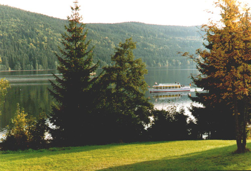 Es geht weiter auf der B 317 in die Gemeinde Bärental. Über die Bundesstraße 500 geht es durch Neu- und Altglashütten in Richtung Schluchsee. Auf der Bundesstraße fahren wir, am verträumt liegenden Windgfällweiher vorbei, durch den Ortsteil Aha zum Schluchsee. Der Schluchsee hat eine Fläche von 5,1 Quadratkilometern und zählt mit seinem Stauraum von 108 Mio. Kubikmetern zu den größten Stauseen Deutschlands. Der See ist durch seine windige Höhenlage ein Paradies für Surfer und Segler. Entlang am nördlichen Ufer fahren wir bis in die Gemeinde Schluchsee-Ort. Die zahlreichen Cafés mit ihren schönen Seeterrassen sind sehr einladend. Die Schlußetappe führt uns über eine acht Kilometer lange Landstraße nach Lenzkirch. Von Lenzkirch erreichen wir, über die B 315 und die B 317, das südliche Ufer des Titisees. Die Straße führt oberhalb des Sees entlang. Den Versuch, ein wenig des Titisees vom Motorrad aus zu sehen, geben wir wegen der dichtstehenden Fichten auf. Von der B 317 biegen wir links auf die B 31 Richtung Titisee-Ort ab.